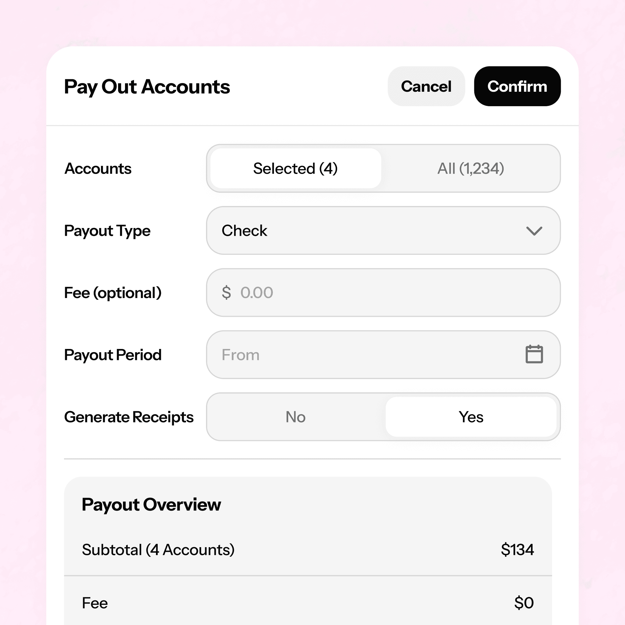 Absolutely! Filter by balance, pick a payout date, choose a payment method, and settle everyone in a few clicks. For ACH transfers, check out our Checkbook integration.