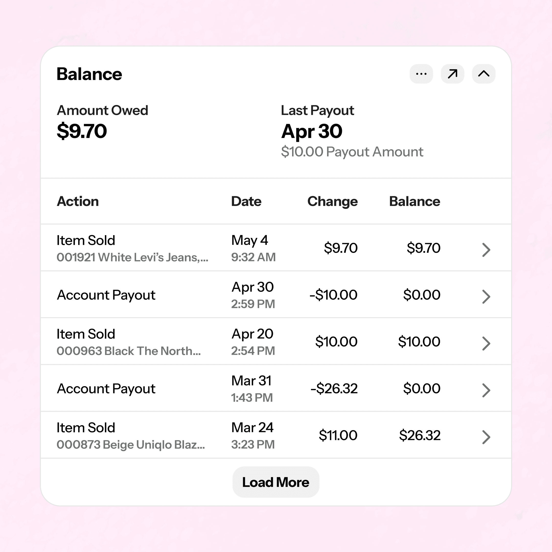 As items sell, balances update on their own. Pay out one at a time or in bulk — receipts included.