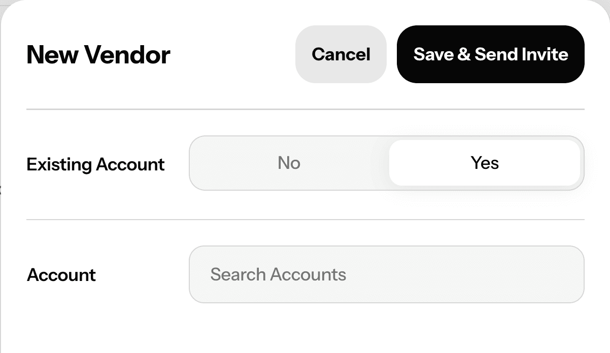 Add vendors one at a time from the Vendor Settings page or directly from any existing account profile. New vendor? You can create the account and send the invite in one step.